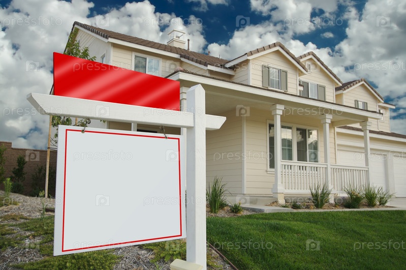 Пустой знак о продаже недвижимости и новый дом