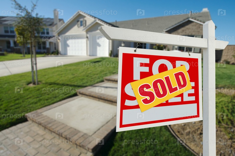 Знак продажи недвижимости перед новым домом