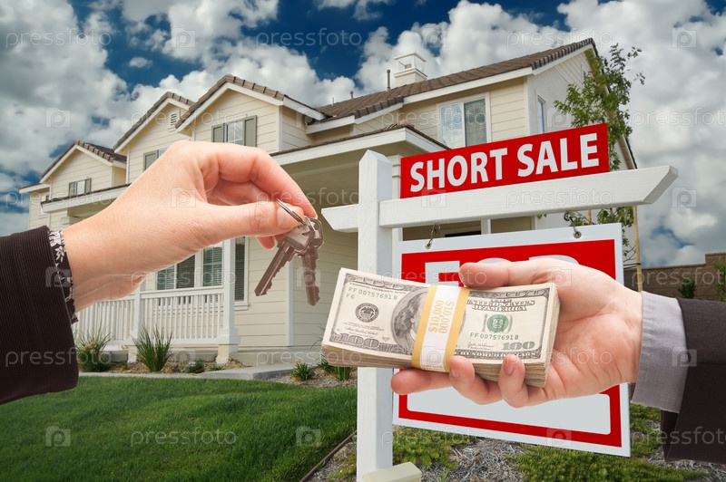 Передача наличных и ключей от дома на фоне таблички о продаже