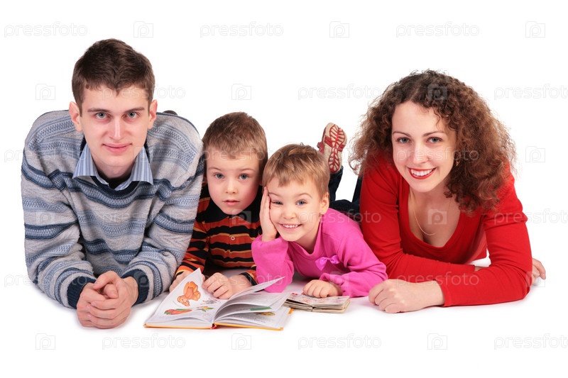Родители и дети с книгами смотрят в камеру