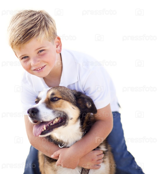 Мальчик со своей собакой на белом фоне