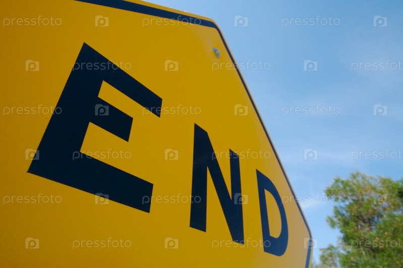 Желтый знак с надписью "конец" на фоне голубого неба