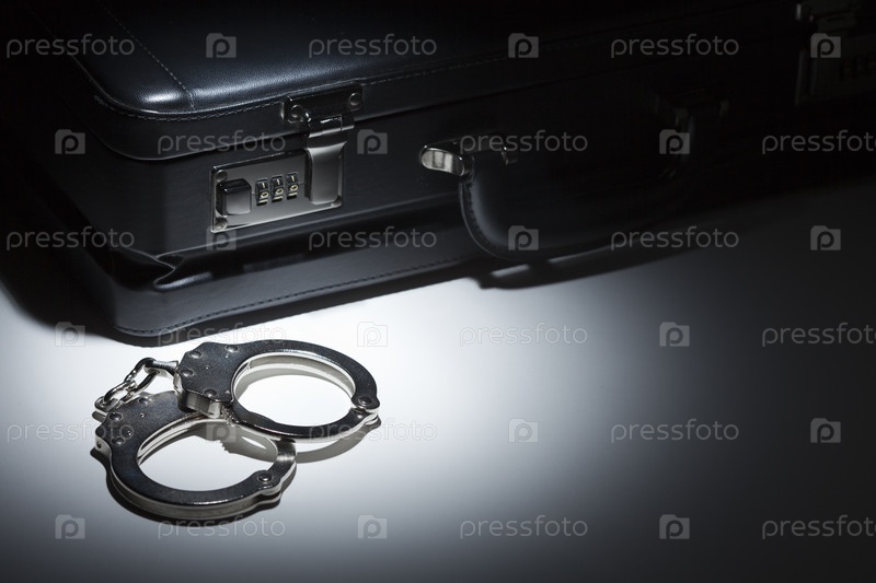 Пара наручников и портфель под лучом света