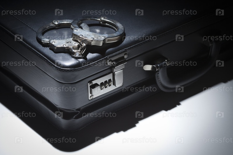 Пара наручников и портфель под лучом света
