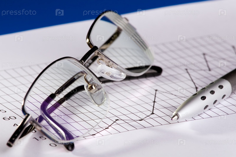 Ручка и очки лежат на бумаге с изображением диаграммы роста прибыли