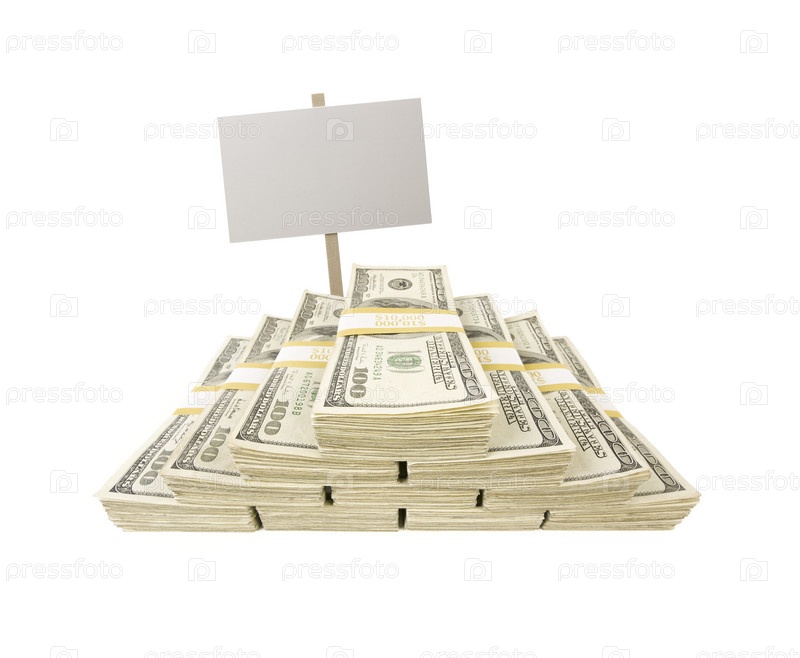 Стопка стодолларовый купюр и пустой знак на белом фоне