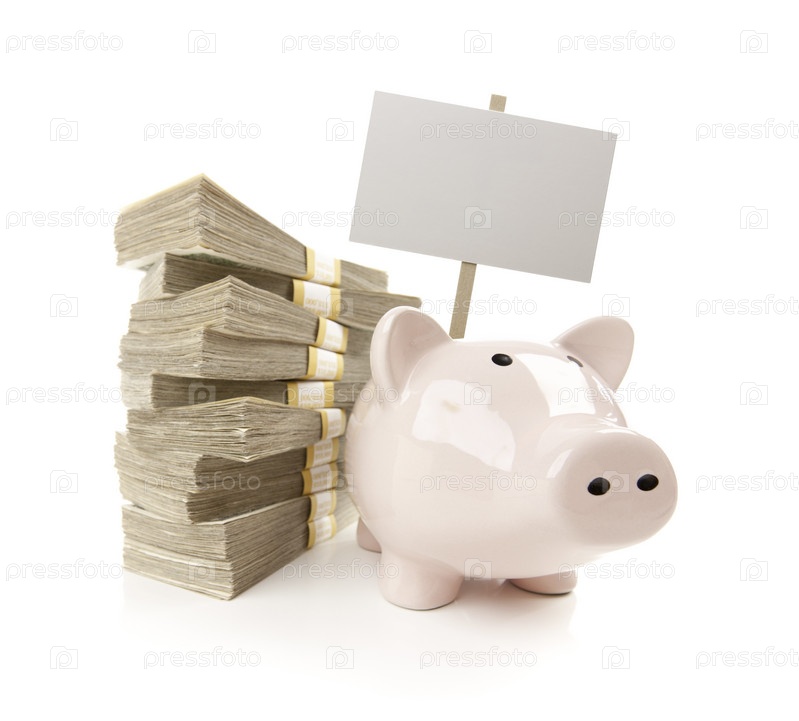 Розовая копилка, стопка денег и пустой знак
