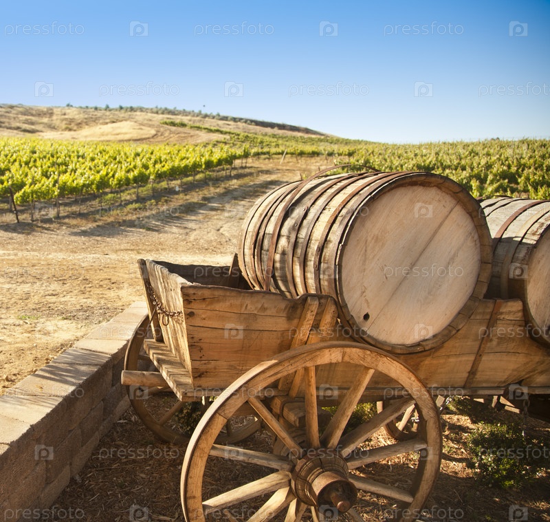 Старая повозка с бочкой на винограднике