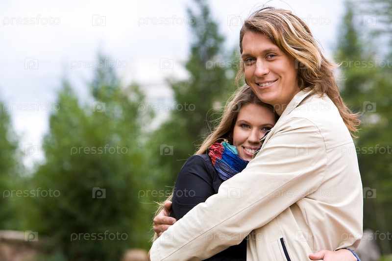 Портрет любящей пары, обнимающейся на свежем воздухе