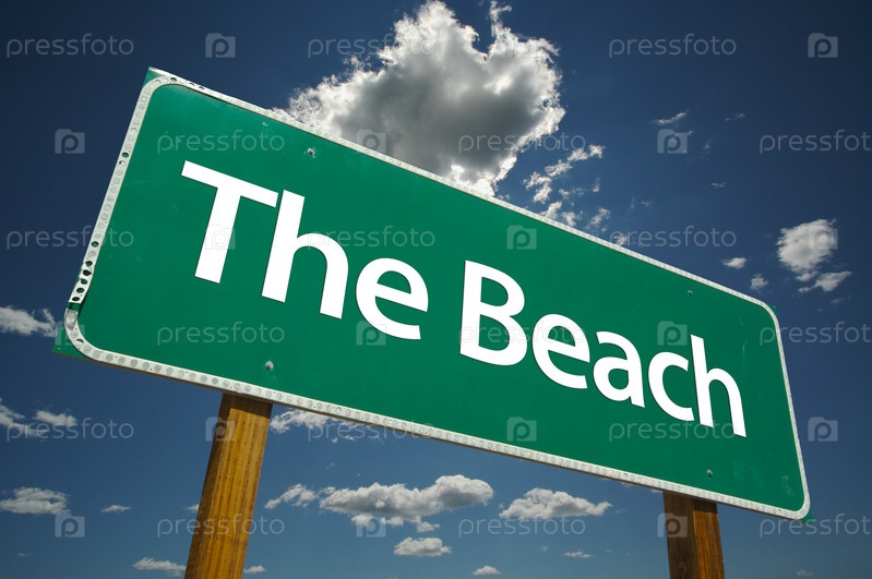 Зеленый дорожный знак с надписью The Beach