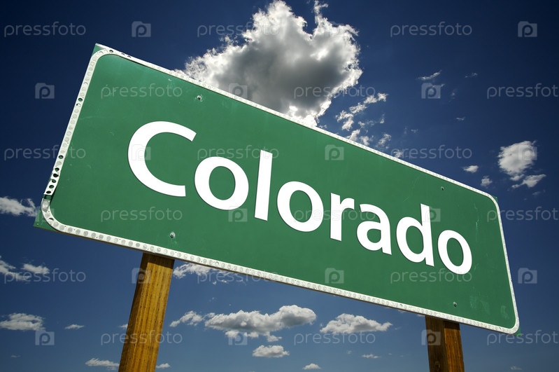 Зеленый дорожный знак с надписью "Колорадо"