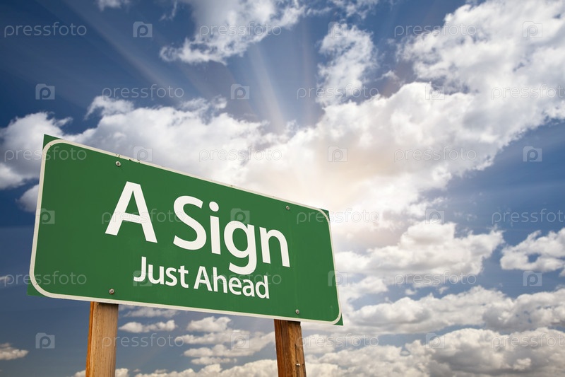 Дорожный зеленый знак ЗНАК на фоне облаков