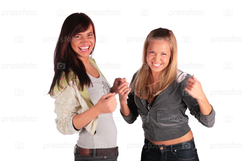 Две смеющиеся девушки сжимают руки в кулаки