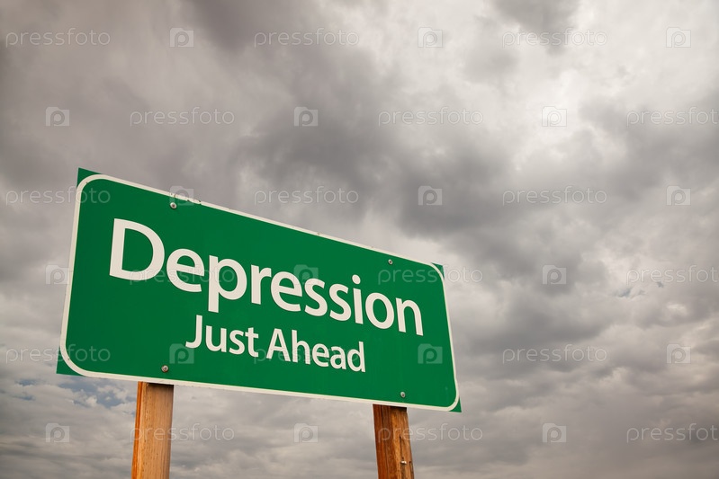 Зеленый дорожный знак ДЕПРЕССИЯ на фоне туч
