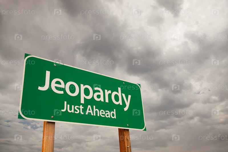 Зеленый дорожный знак ОПАСНОСТЬ на фоне туч