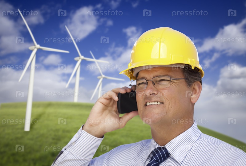 Мужчина в строительной каске на фоне луга