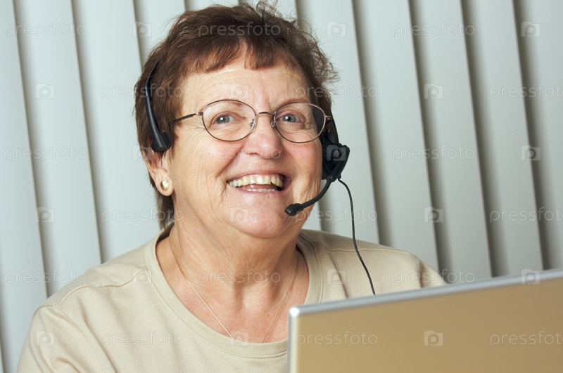 Улыбающаяся пожилая женщина с телефонной гарнитурой