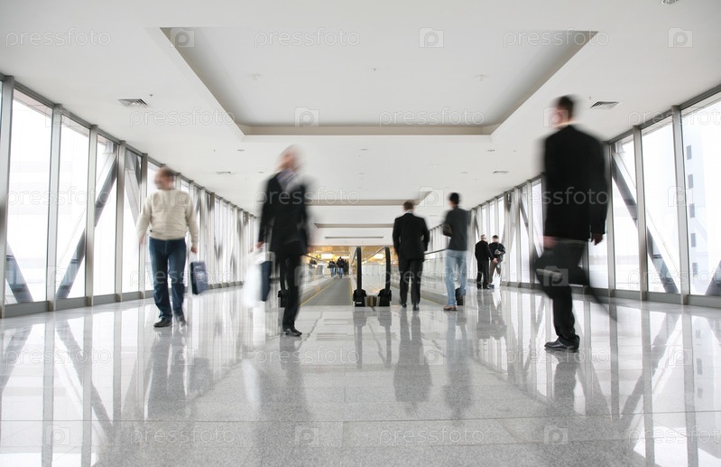 Люди идут по переходу в бизнес-центре