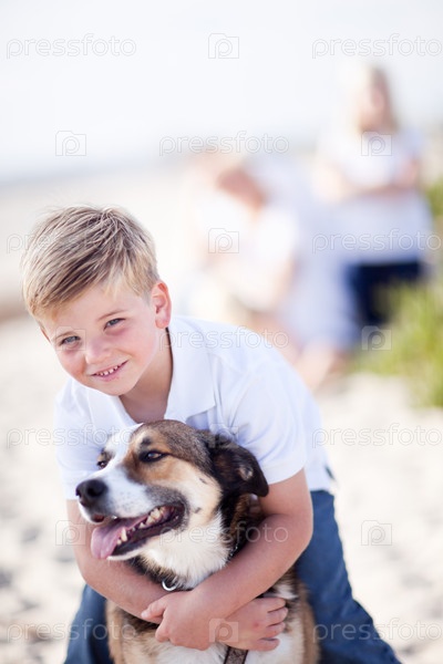 Красивый мальчик играет с собакой