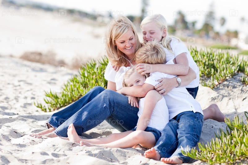 Привлекательная женщина с детьми на пляже