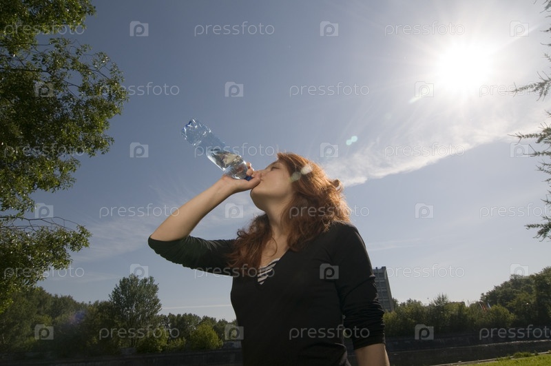 Девушка утоляет жажду на солнце