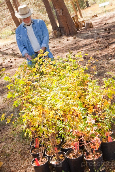 Привлекательный пожилой мужчина смотрит на комнатные растения