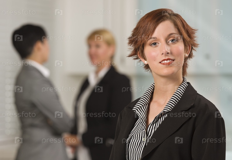 Симпатичная рыжеволосая бизнес-леди с коллегами