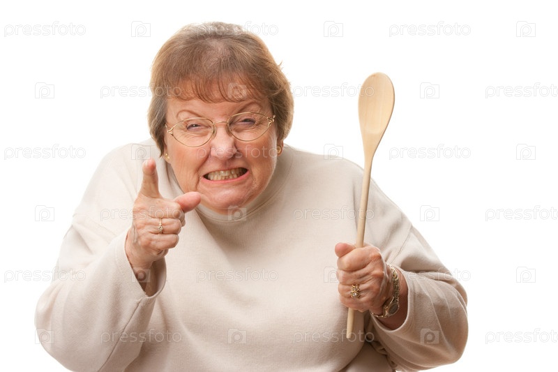 Расстроенная пожилая женщина с деревянной ложкой