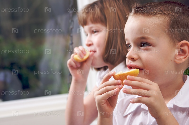 Сестра и брат едят яблоко