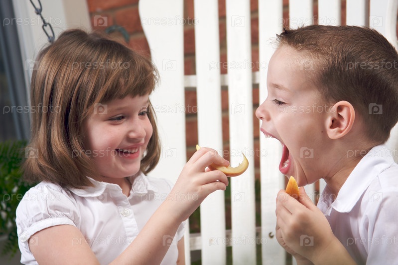 Сестра и брат едят яблоко