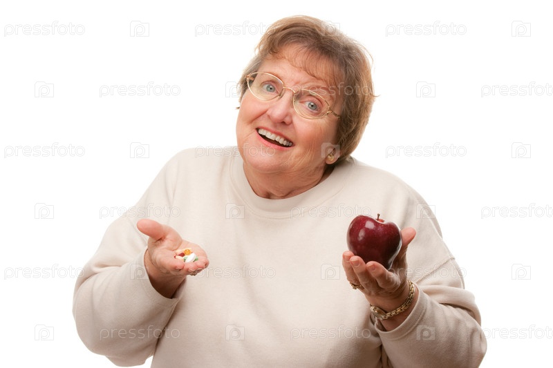 Смущенная пожилая женщина, держащая яблоко и витамины