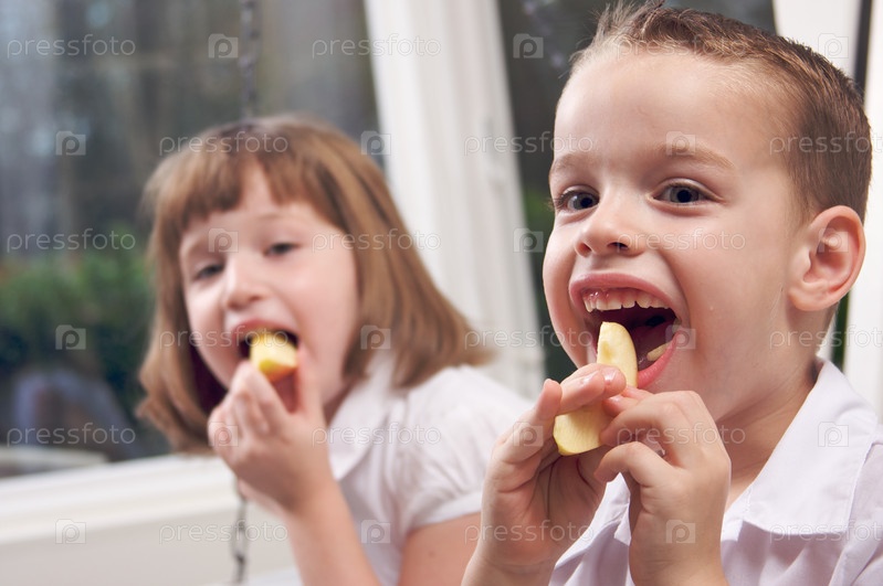 Сестра и брат едят яблоко