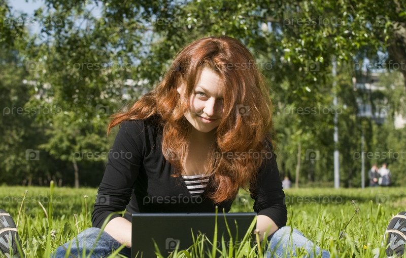 Девушка сидит на траве с ноутбуком
