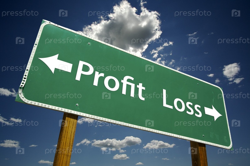Зеленый дорожный знак с указателями и надписями "прибыль" и "убыток" на фоне неба