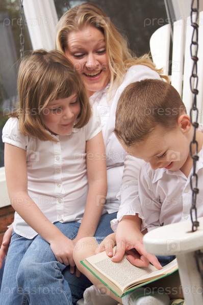 Мальчик читает книгу матери и сестре