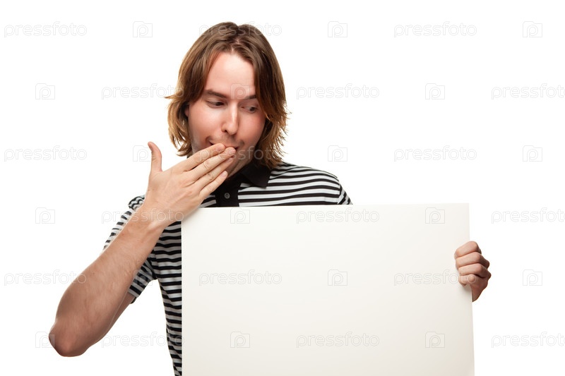 Улыбающийся молодой человек, держащий чистый белый плакат