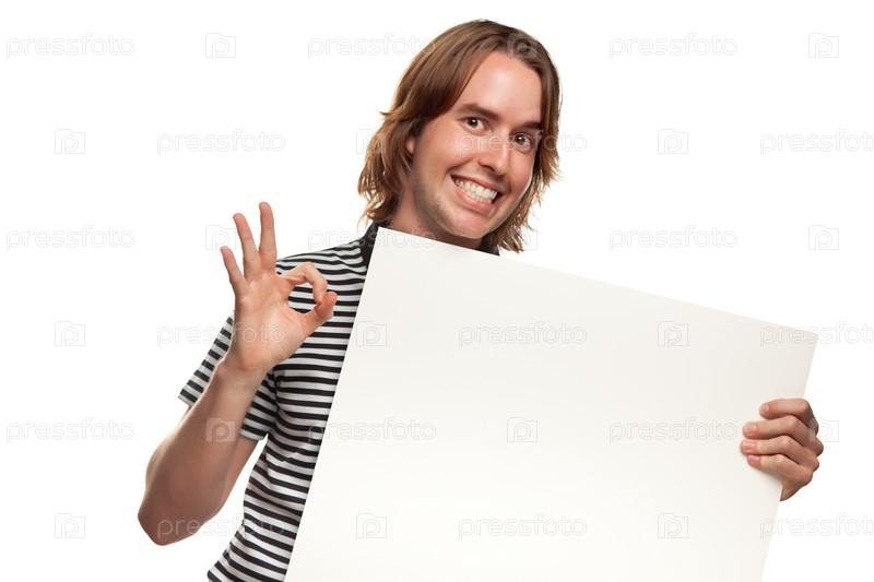Улыбающийся молодой человек, держащий чистый белый плакат
