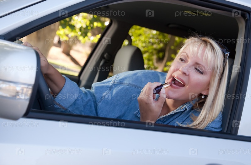 Женщина красит губы во время вождения