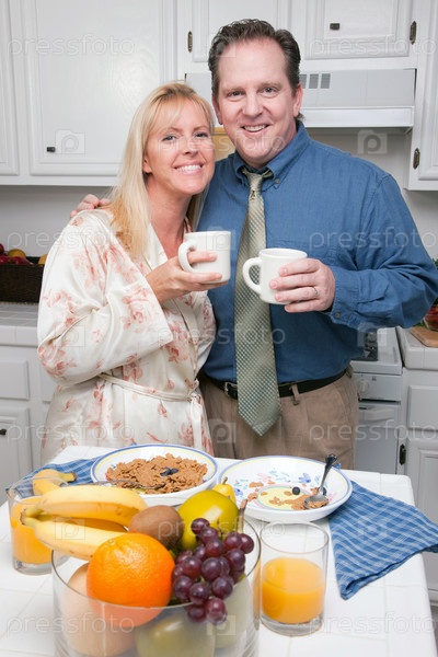 Счастливая привлекательная пара в кухне
