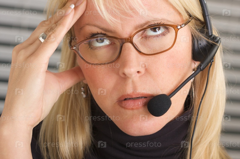 Задумчивая бизнес-леди с телефонной гарнитурой