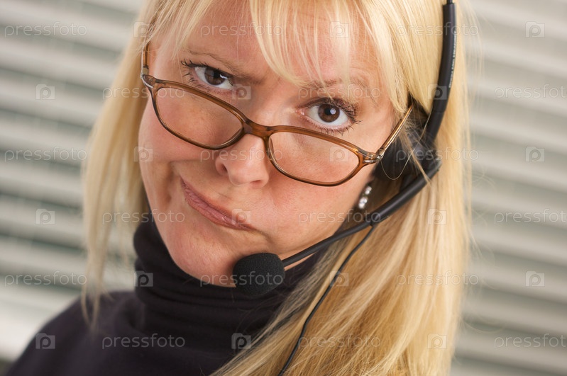 Задумчивая бизнес-леди с телефонной гарнитурой