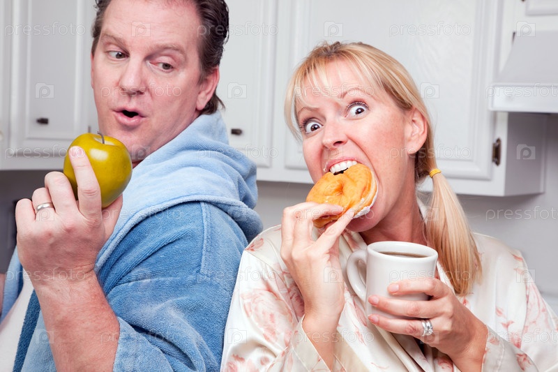 Мужчина с апельсином и женщина с пончиком на кухне