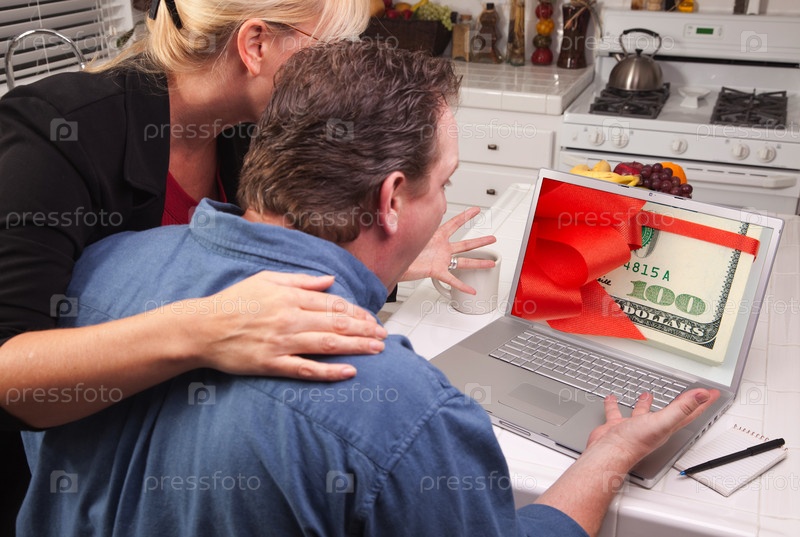 Пара использует ноутбук в кухне. Деньги