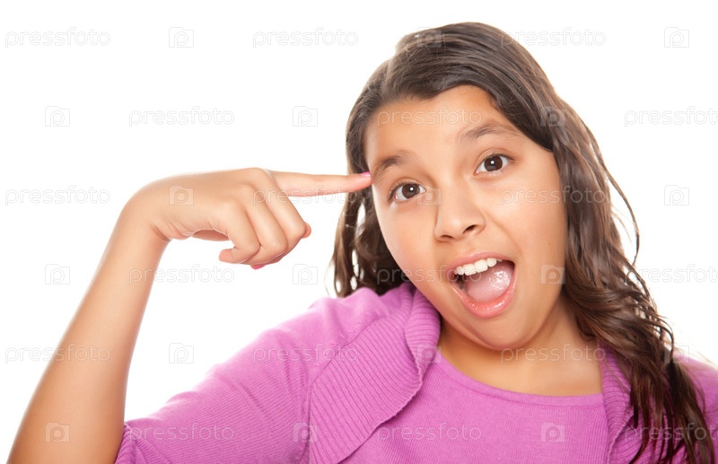 Девочка указывает пальцем на голову на белом фоне