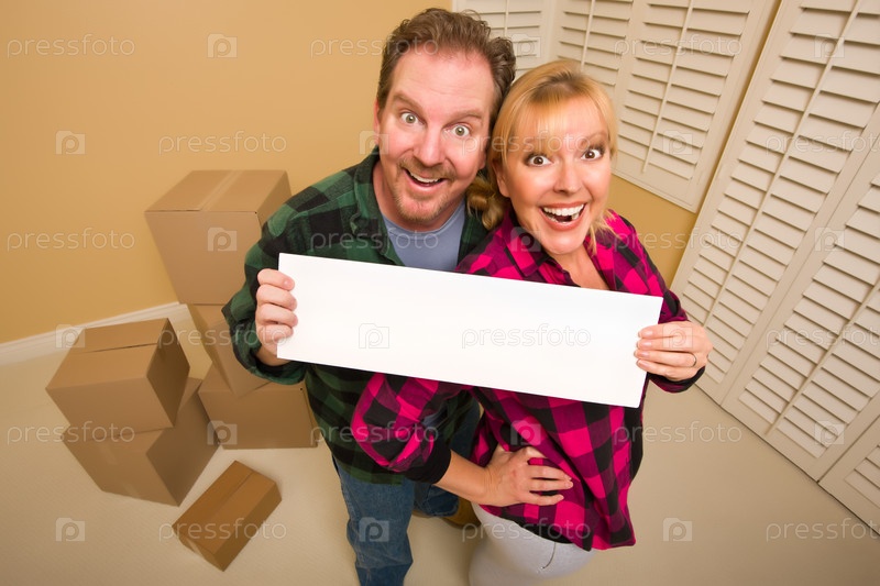 Семейная пара с баннером в руках в пустой комнате