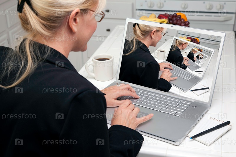 Женщина работает с ноутбуком на кухне