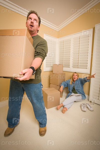 Утомленный мужчина перемещает коробки для требовательной жены