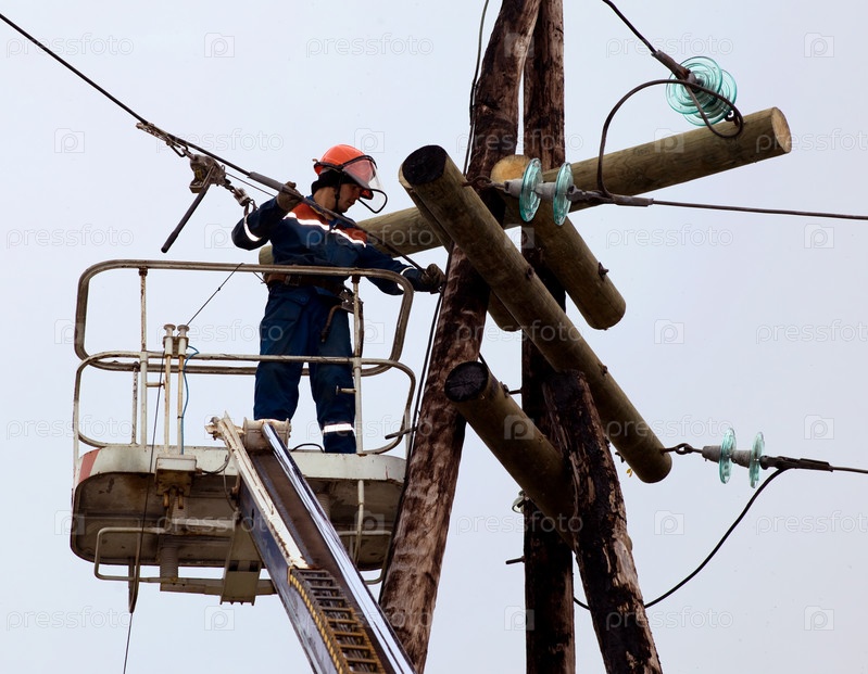 Электрик соединяет провода на линии электропередачи