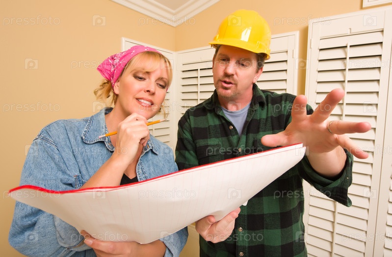Подрядчик в каске обсуждает план с женщиной