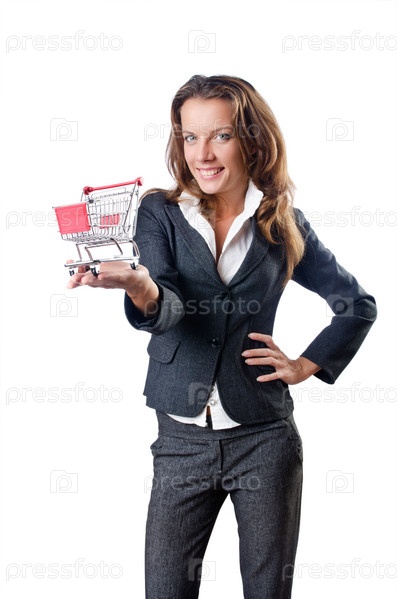 Привлекательная бизнес-леди с корзиной на белом фоне
